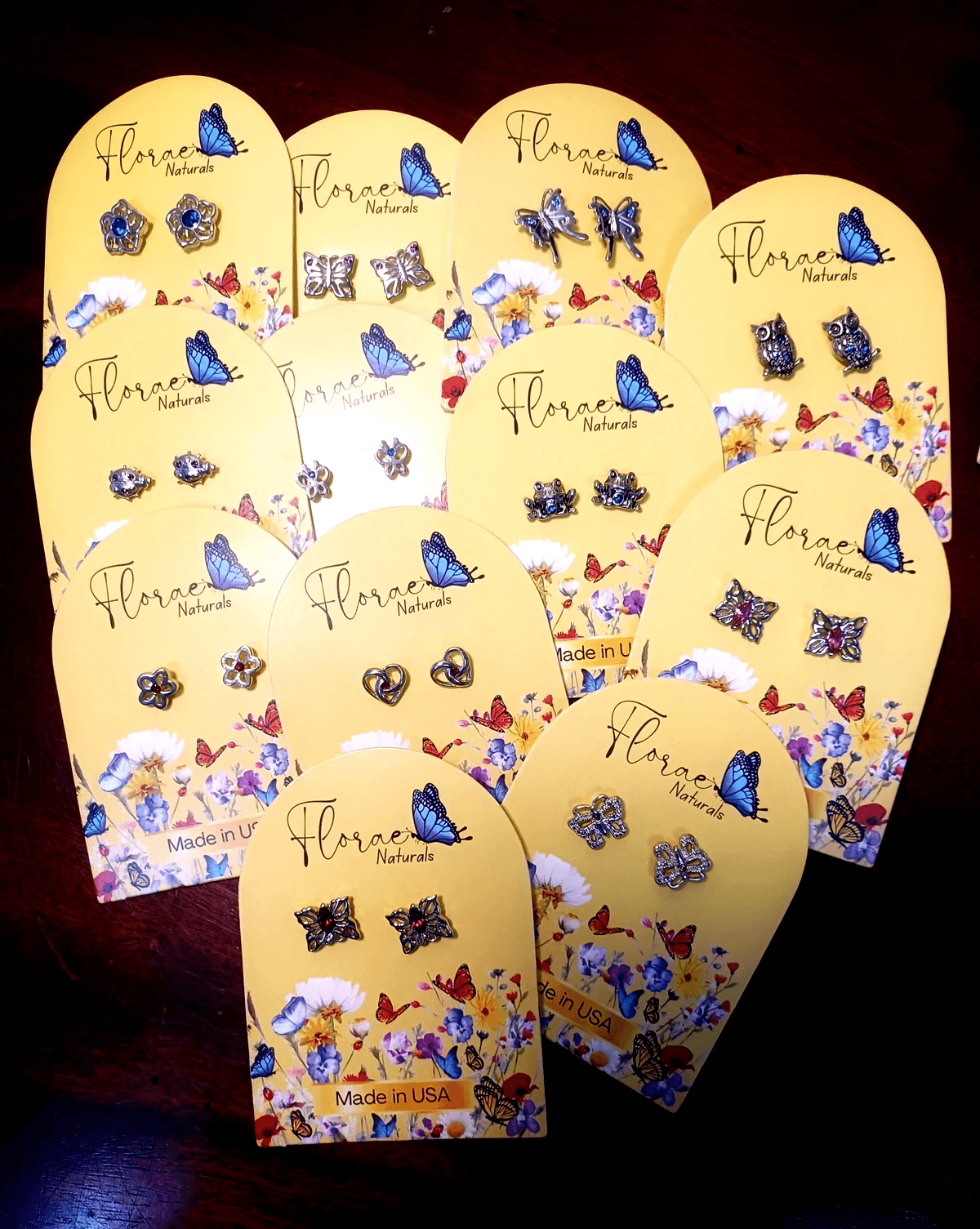 Beautiful Acrylic display showcases the Pressed Flower art designs and Real Flower Jewelry.